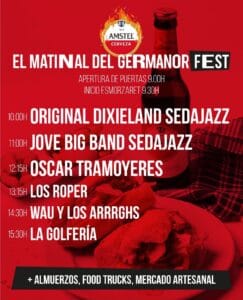 El evento se dividirá en dos partes. Por la mañana, el “Matinal del Germanor Fest” permitirá a los asistentes degustar almuerzos de locales finalistas de la convocatoria Som Esmorzadors, como Ca Rakel, Casa Baldo, Gastro Triquet, Horchatería Cal Carrero, Bar Magallanes y La Mesedora.